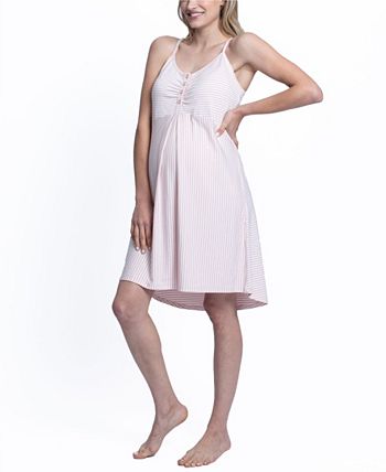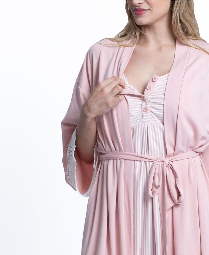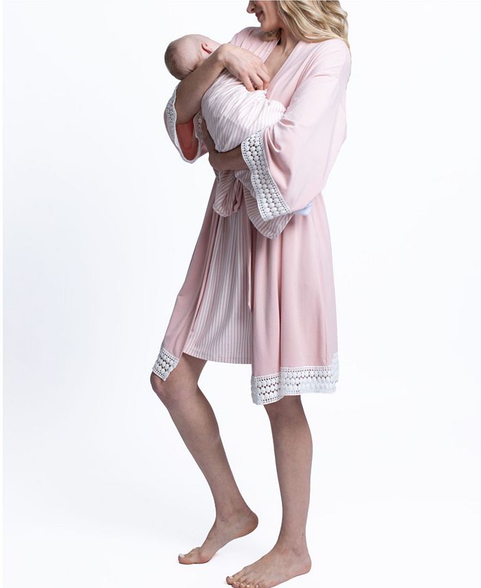 Stay comfy and cozy after baby arrives in a lightweight nursing dress paired with a soft, crochet-trimmed robe and a matching baby snuggle sack and headband.