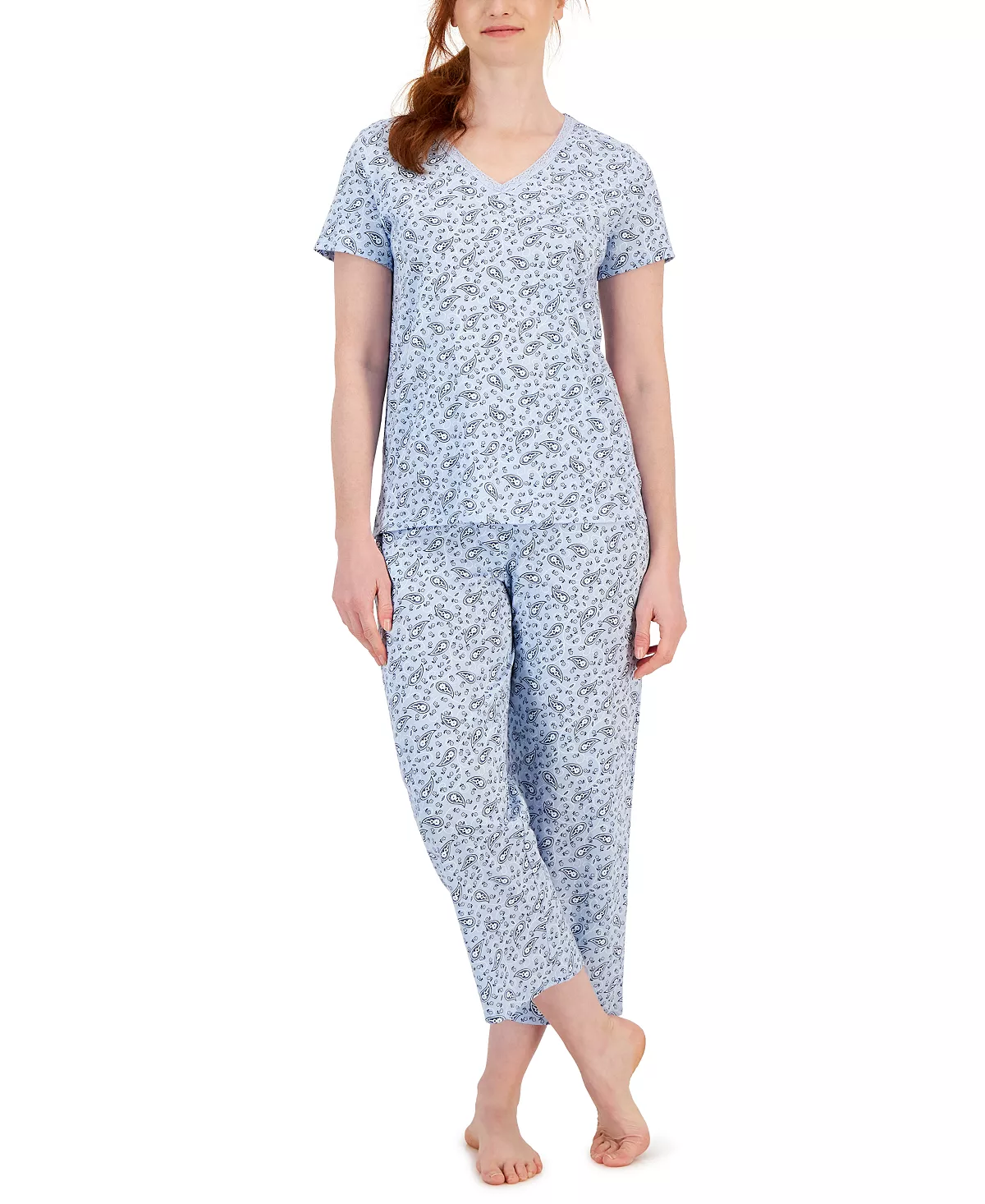 A cozy pair from Charter Club, these cotton pajamas feature a short-sleeve top with pretty lace trim and matching pants in a cropped silhouette.