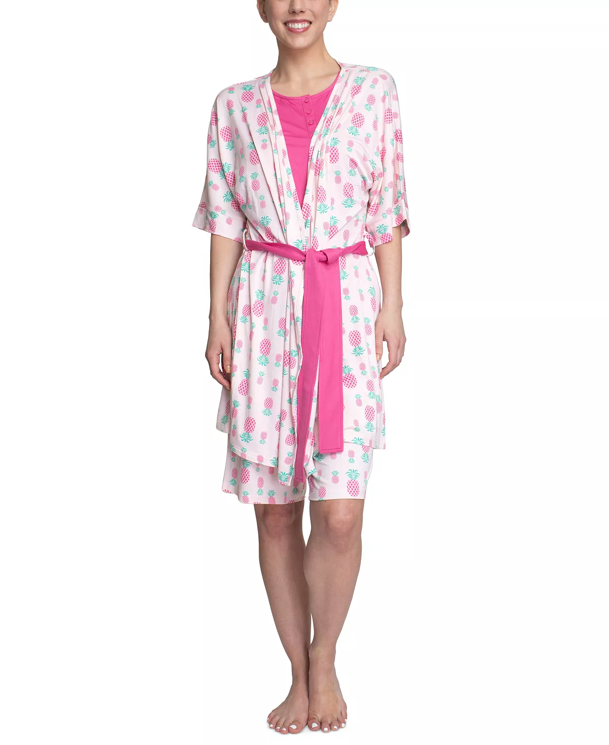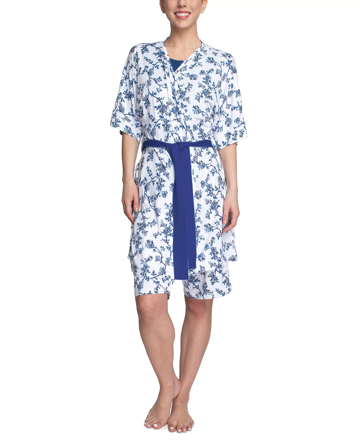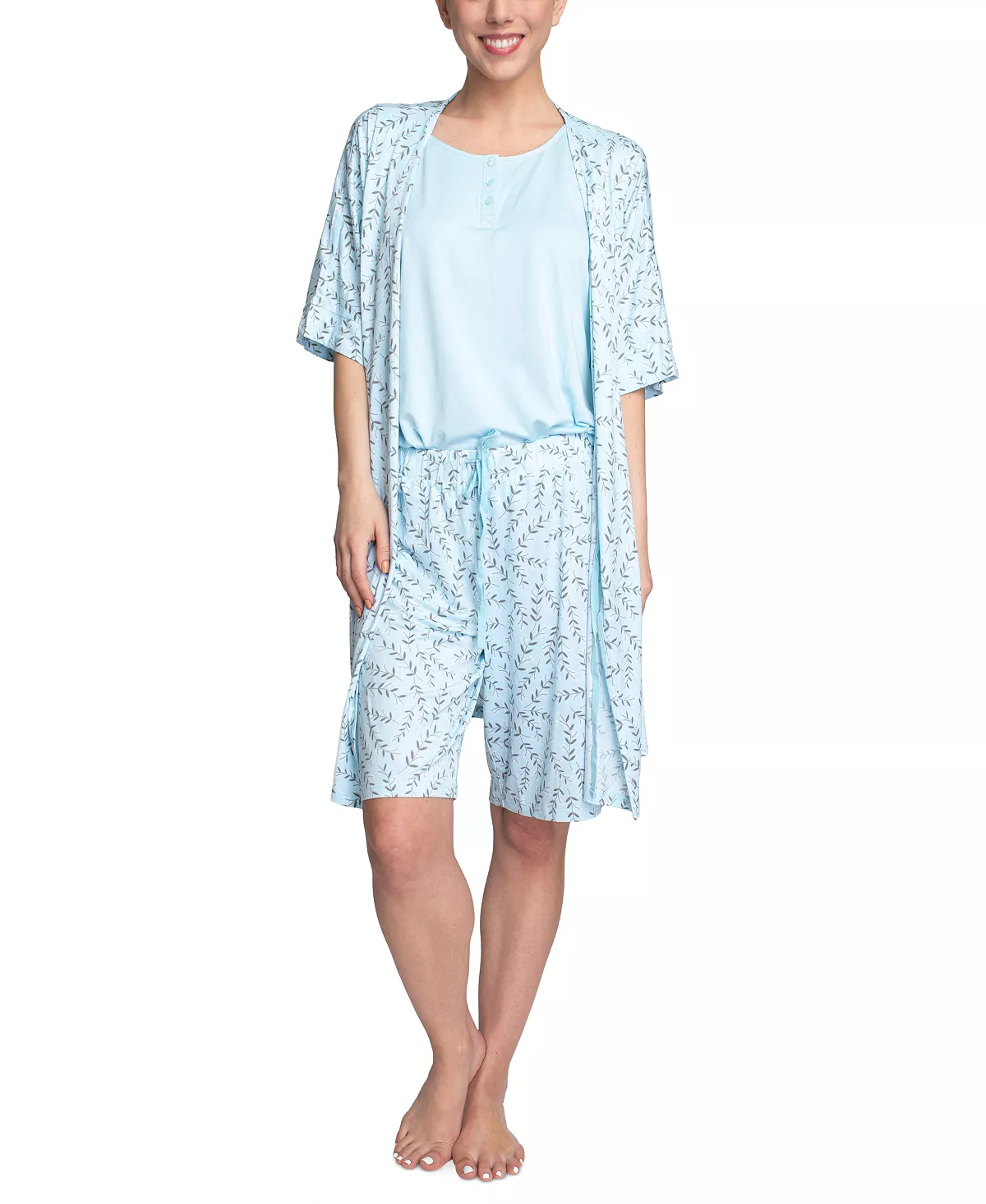 Hanes makes packing for a trip a lot easier with this three-piece set that includes a soft-knit tank and Bermuda shorts, with a flattering elbow-sleeve robe.