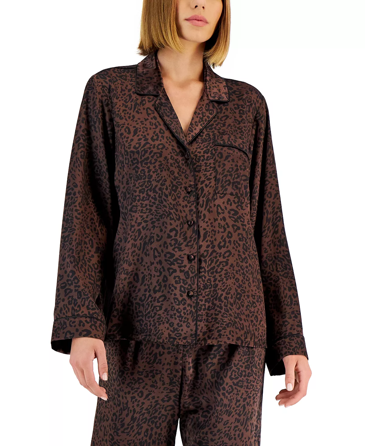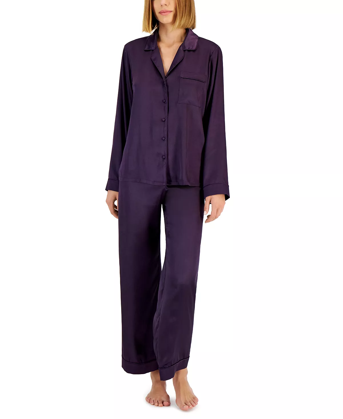 The leisurely ease of a classic style is uplifted by modern fabrications and polished piping trim in this pajama set from INC International Concepts®.