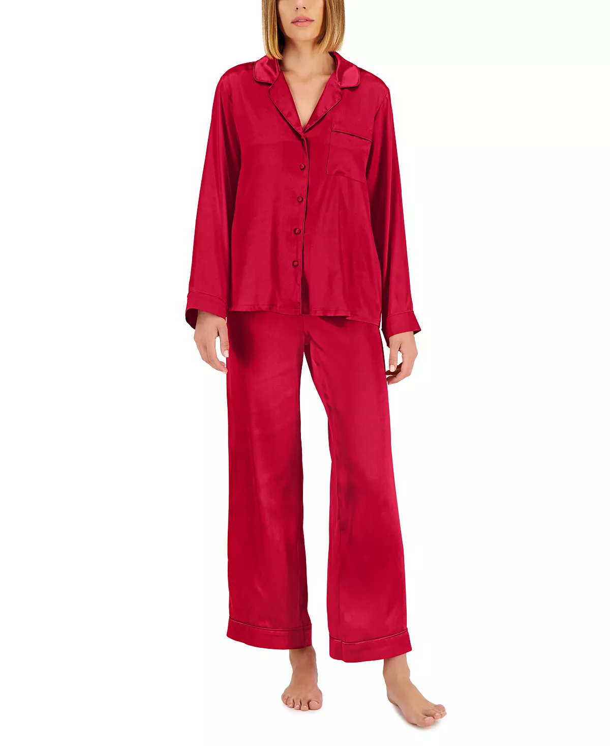 The leisurely ease of a classic style is uplifted by modern fabrications and polished piping trim in this pajama set from INC International Concepts®.