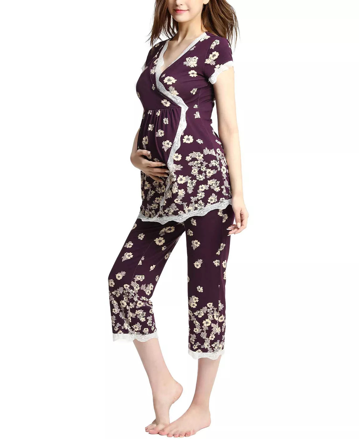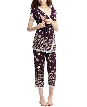 A maternity and nursing 2-piece pajama set by Kimi & Kai. A ultra soft pajama top is designed to adapt to your changing body from pregnancy to motherhood. Comfy capri length over belly pant is designed especially for C-section recovery.