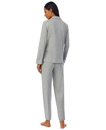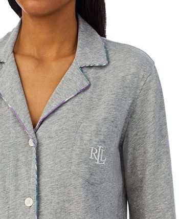 Bask in the comfort of this Lauren Ralph Lauren knit long sleeve notch collar pajama set. The button-front top features elegant pipping trim and the LRL monogram embroidered on the chest pocket.
