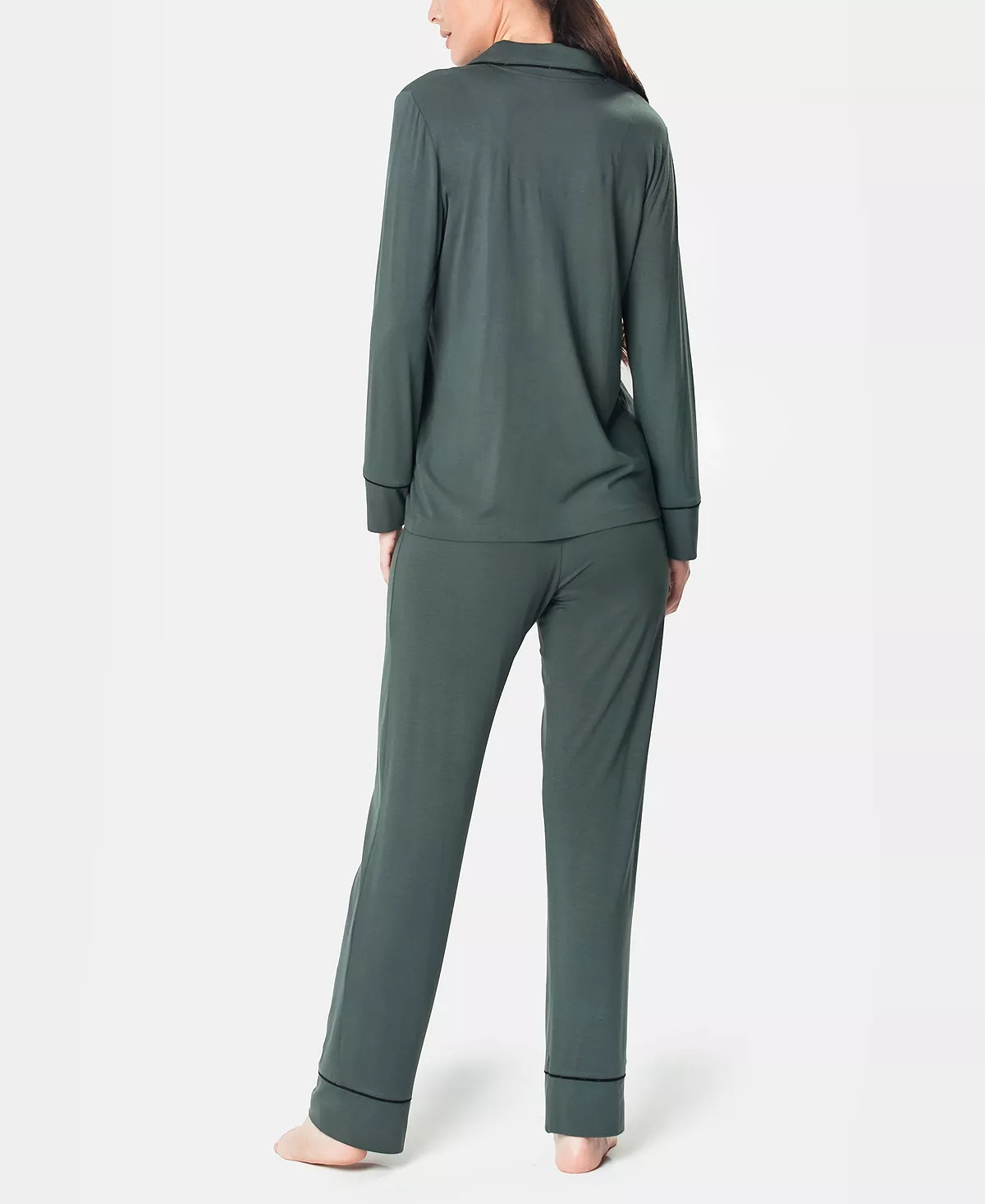 - Pants- full length hits at ankle, inseam 30.7″ long, self-hem bands with contrast knit piping, mid-rise elastic waistband